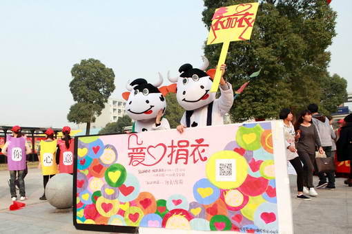 装扮成卡通人偶的该学院党校学员正在招揽师生们参与“爱心捐衣”活动。
