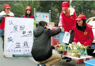 居民可以用废旧电池换取绿色盆栽,用实际行动爱护环境、保护土地。
