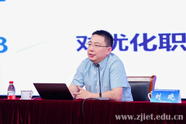 在专家报告环节,浙江工业大学教育学院副院长、浙江省职业教育发展研究院副院长、博士生导师刘晓教授作了题为《教育强国,我们期待什么样的职业教育评价》的报告。他从教育评价的重要性入手,回顾了我国高职院校办学评价的四个发展阶段,阐述了高职院校办学评价的演进特征和类型特色特征,结合高校考核评价的经验,对高职院校办学评价展开了深入思考。